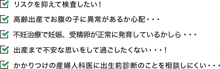 出生前カウンセリングによる全染色体検査は採血のみなので胎児に影響を与えるようなリスクはありません。
