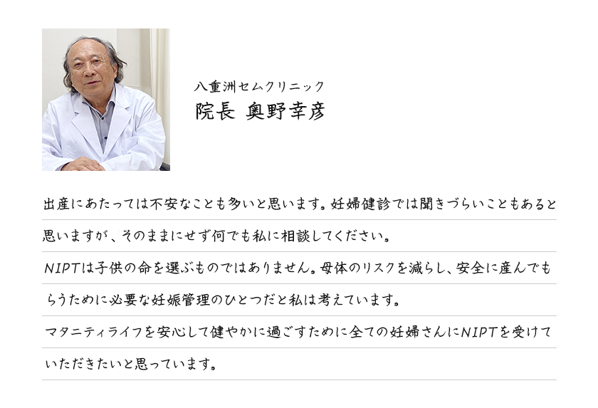 などのお悩みに全てお答えいたします。 院長の奥野はNIPTの検査が誕生する前から、羊水検査を実施してきました。45年間、多くの妊婦さんに寄り添い検査をしてきた実績がございますので、安心しておまかせください。