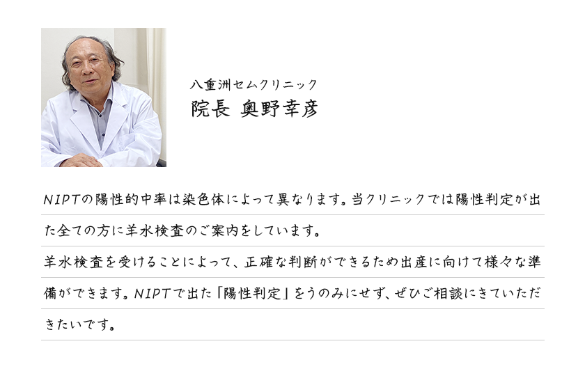 検査項目の陽性判定が出た場合、院長の奥野がカウンセリングを実施いたします。 陽性となった染色体が引き起こす病気や疾患についての説明や、羊水検査についての説明を丁寧に行います。