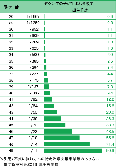 お腹の赤ちゃんが健康に育っているか、多くの妊婦さんが不安に思っています。 母体年齢によって出生頻度は変わりますが、ダウン症などの染色体異常は年齢に関係なく一定の割合で発生します。