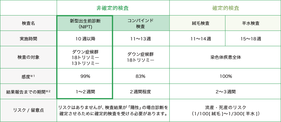 出生前診断は《非確定検査》と《確定検査》に分けられます。大きな違いは検査精度とリスクです。